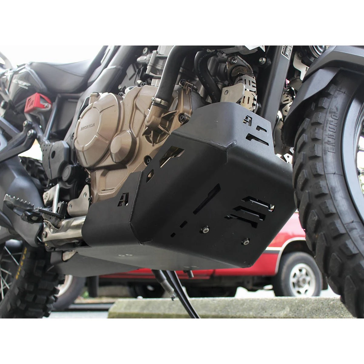 This part is the skid plate extension only and does not include the skid plate. Honda makes their return to the adventure market with the rebooted Africa Twin. Like its Dakar-winning predecessors, it’s designed to conquer the toughest terrain you can throw at it. A lot can happen when you leave the pavement on a 534-lb (242-kg) motorcycle. The AltRider skid plate was engineered from the ground up to provide better coverage, strength and ground clearance than any other skid plate on the market. The optional AltRider Skid Plate Extension is a modular add-on part that extends Altrider’s already generous skid plate protection all the way back to the rear shock linkage.Honda’s Africa Twin utilizes a classic dirtbike-inspired dual frame rail. AltRider embraced this approach by designing a skid plate that builds on the advantages provided by this type of frame.