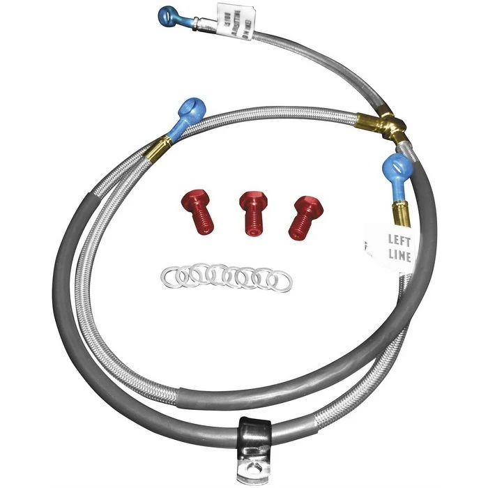 Kit consists of a clear SS line, blue aluminum fittings and red aluminum banjo bolts with installation instructions