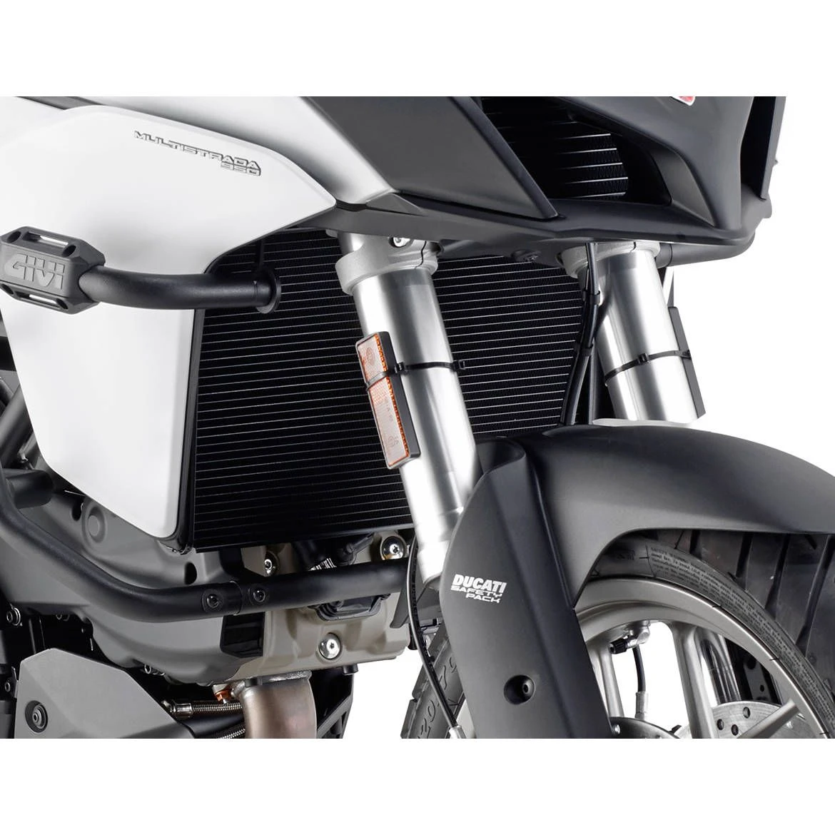 The Givi PR7408 Radiator Guard is stainless steel to resist corrosion and features a painted black finish to match the aesthetics of the Ducati Multistrada.