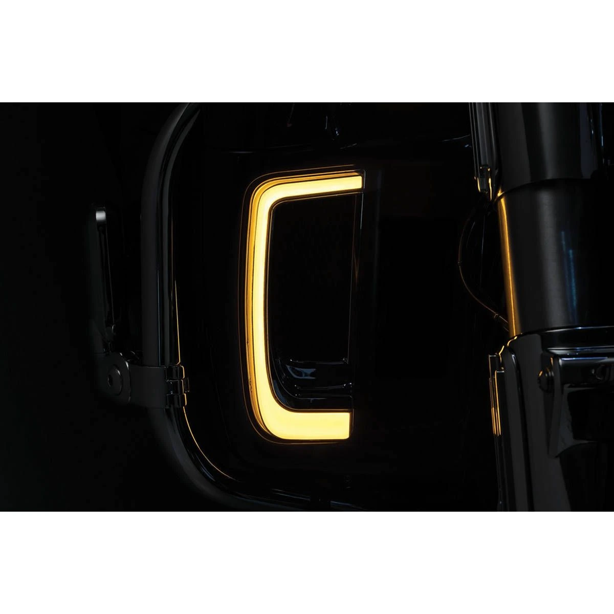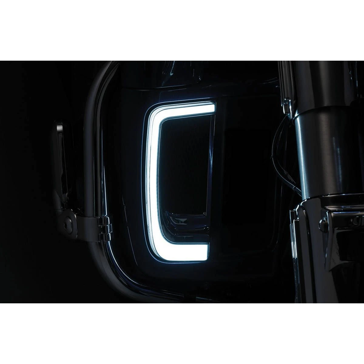 Intense, fully diffused L.E.D. lighting with full-time white running lights and amber switchback turn signals when activated. Significantly enhance your front end’s styling and visibility toward oncoming motorists with these direct snap-in replacements for the black plastic radiator grills or filler plates on late-model H-D fairing lowers.