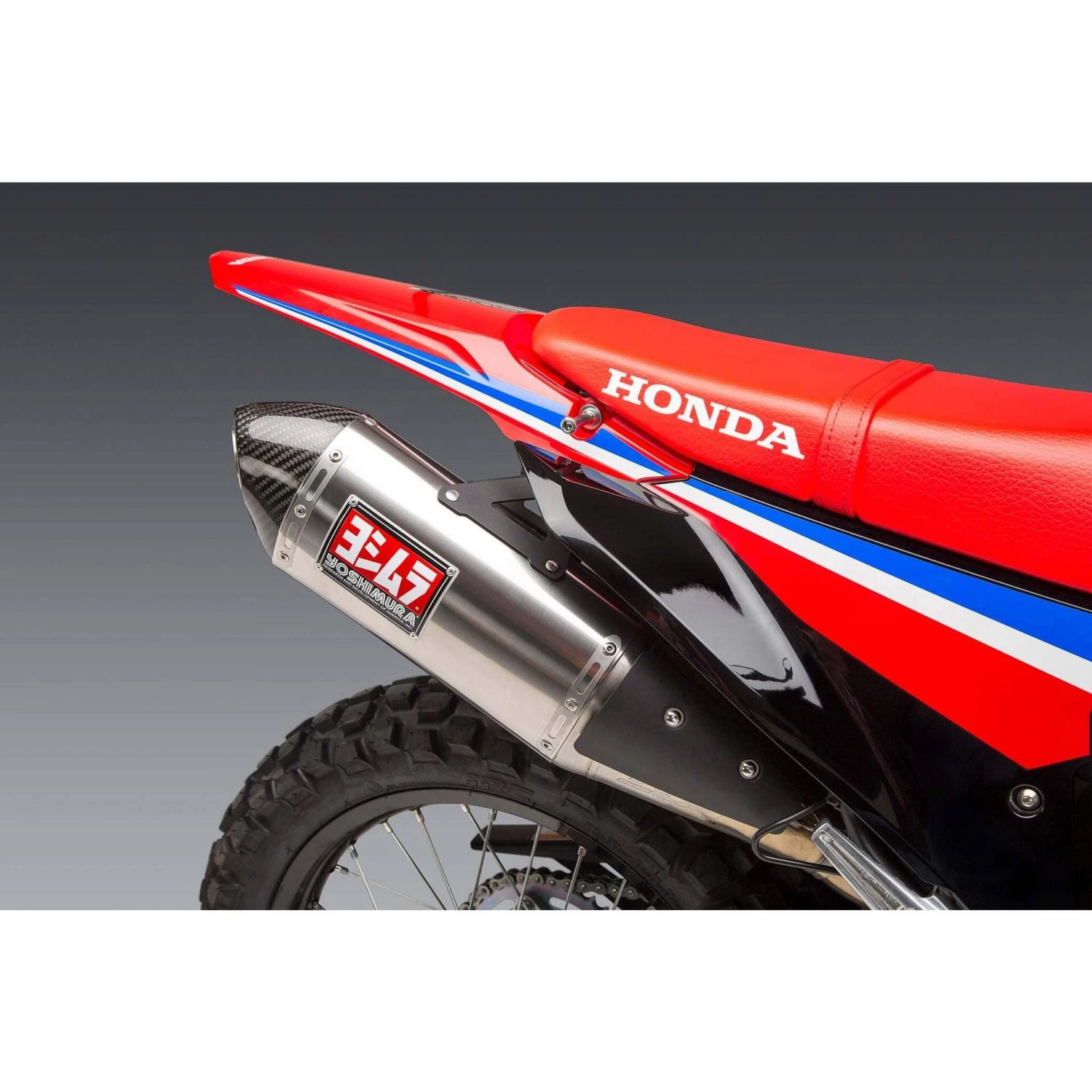 While the RS-4 Exhaust was debuted as Yoshimura’s premier exhaust for off-road racing applications, R&D couldn’t stop there. They have mated this sophisticated and stylish muffler to compliment the styling of the new bike. The RS-4 is pentagonal shaped muffler that features a carbon fiber cone end cap, two staged stepped baffle and striking good looks. The RS-4 muffler features a new front cap design that functions as a polyresonant chamber. thus creating a more quiet muffler with improved mid to top end power.